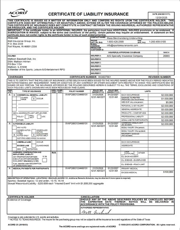 Mattoon Hit-Men Baseball, Inc. ensures that we have Liability Insurance in case of any accidents. We renew our policy each January of the new year.